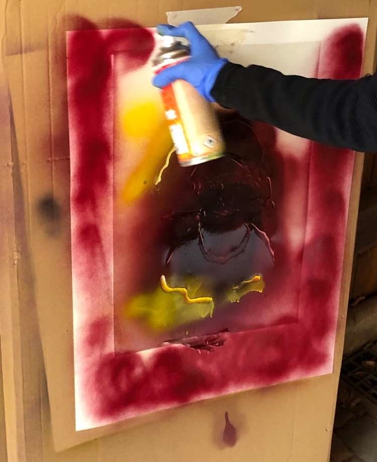 Eine Entdeckung während des Sprayprozesses kann auch das Abdrucken der farbigen Schablonen sein. Die Farbreste auf den benutzten Schablonen können einen Druckprozess initiieren. Diese Ästhetische Wahrnehmung kann den künstlerischen Horizont der Schülerinnen und Schüler erweitern und eine weitere Facette der Technik aufzeigen. Zudem säubert das Abdrucken der Farbreste die Stencils.