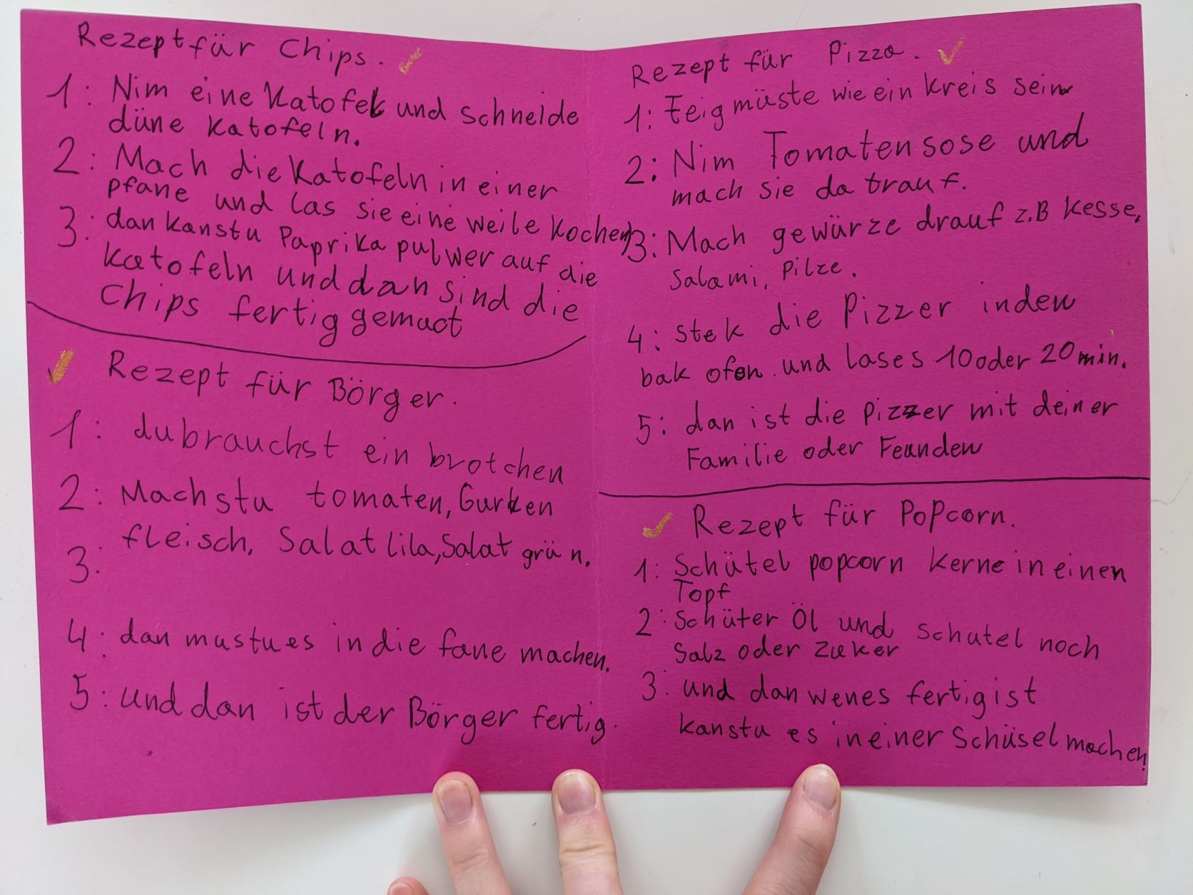 Um die Formen der gestalterischen Praxis möglichst frei zu stellen, können diverse Materialien eingesetzt werden. Die Materialien (Kartonagen, Papiere, Farben…), die für die Umsetzung verwendet werden können, stehen in Kisten zur Verfügung. Die Lehrkraft stellt zudem weitere Materialien wie verschiedene Maluntergründe, Farben, Kameras und Materialien zur plastischen Gestaltung (z.B. Knete) bereit. Die Schülerinnen und Schüler besitzen darüber hinaus selbst eigene Stifte, verschiedenfarbige Papiere und Wasserfarben. In einer ersten Phase (siehe Bilder von Arbeiten von Schülerinnen und Schüler einer 3. Jahrgangsstufe) entwerfen die Schülerinnen und Schüler ihr Bilder. Nach einer Besprechung durch die Lehrkraft setzen die Schülerinnen und Schüler ihre entwickelten Ideen in einer anschließenden Arbeitsphase um.